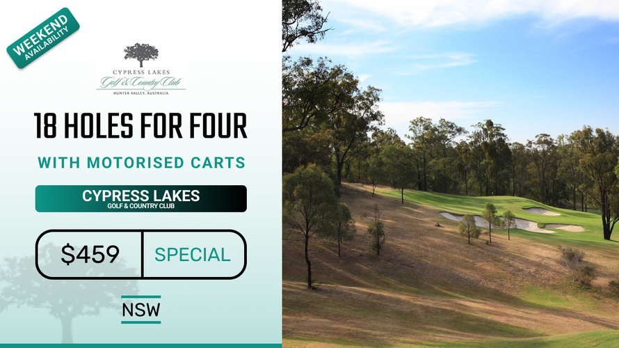 Golf for Four at the breathtaking Cypress Lakes Golf & Country Club in the heart of the Hunter Valley. 18 holes for FOUR in Two Motorised Carts! This offer just $459!