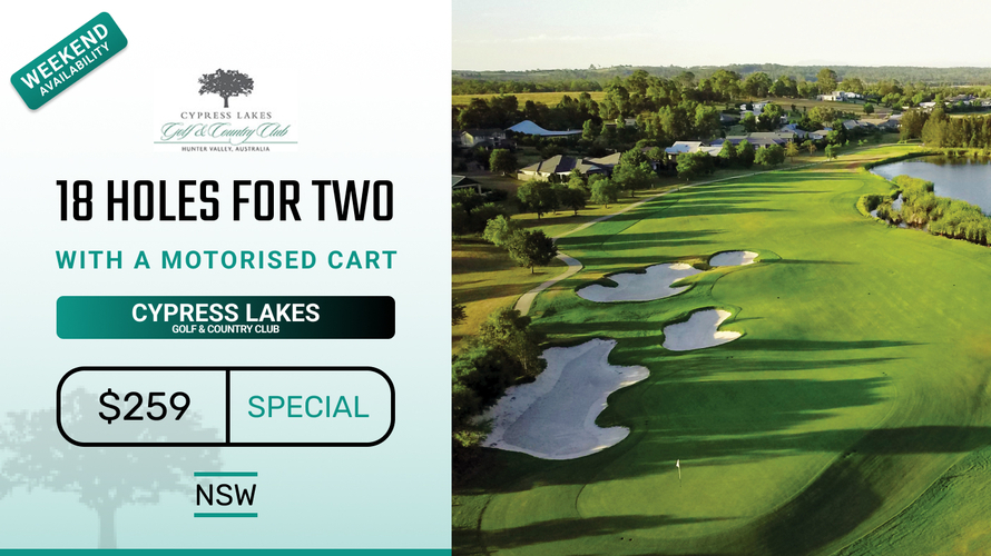 Golf for Two at the breathtaking Cypress Lakes Golf & Country Club in the heart of the Hunter Valley. 18 holes for TWO in a Motorised Cart! This offer just $259!